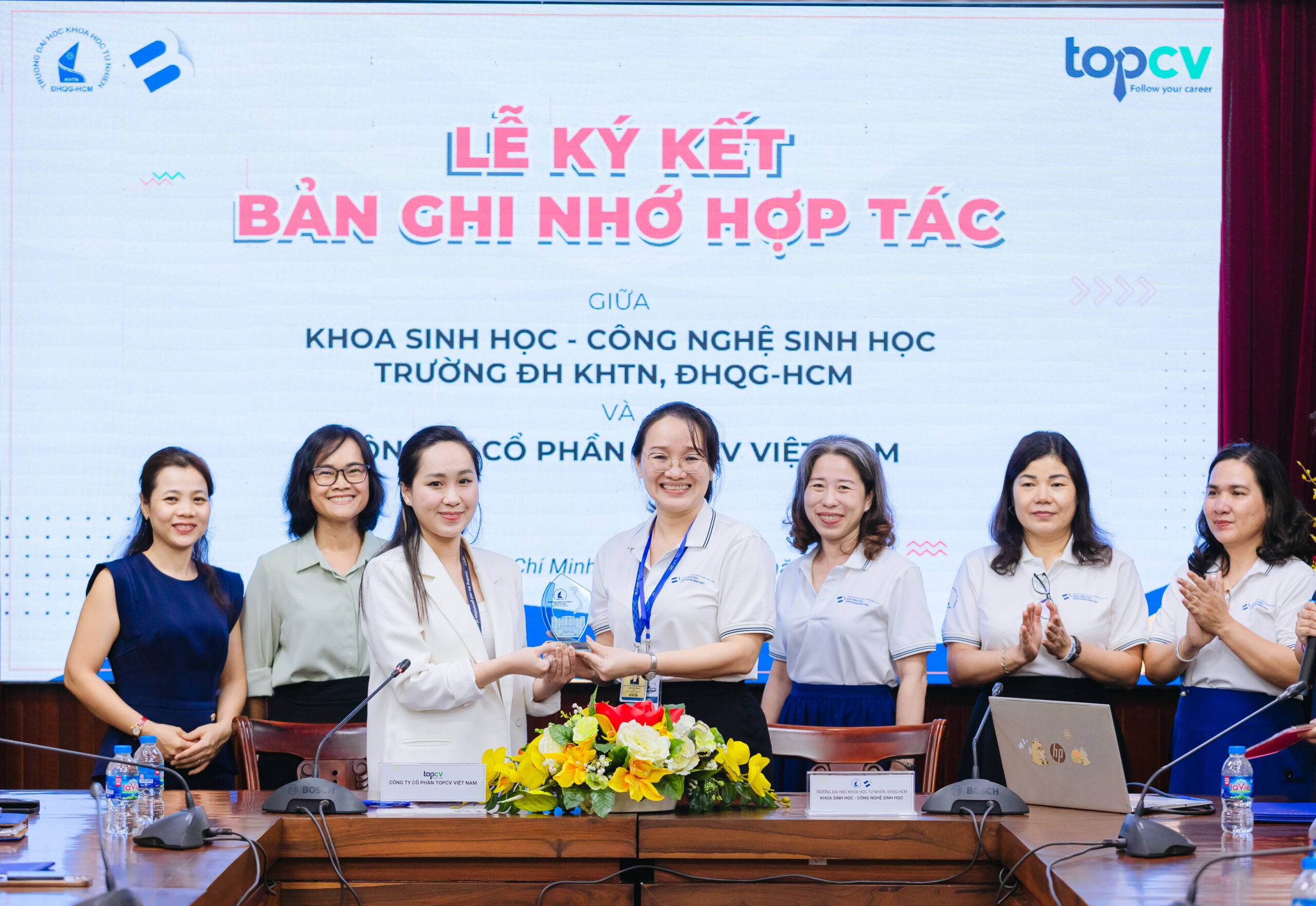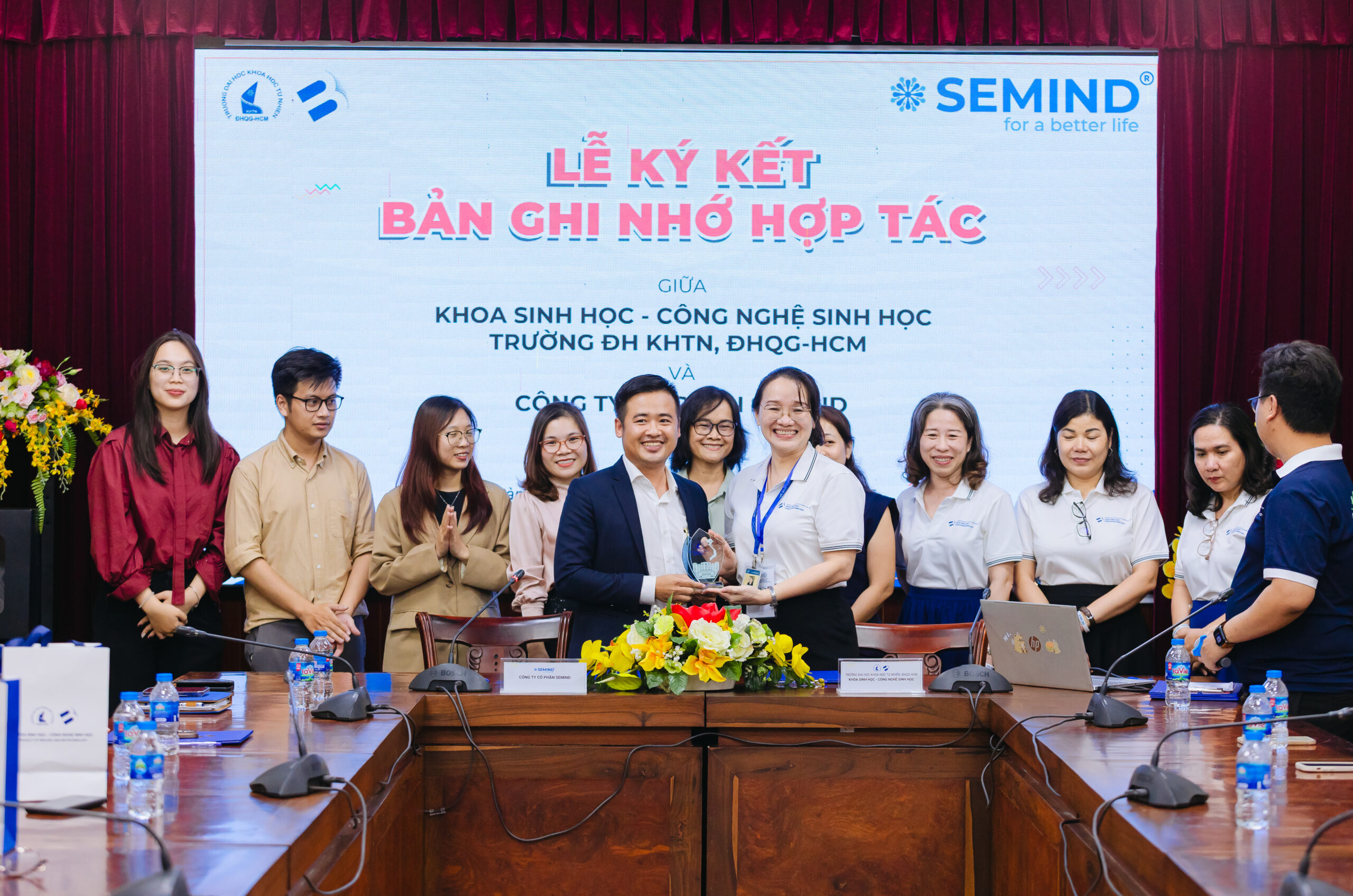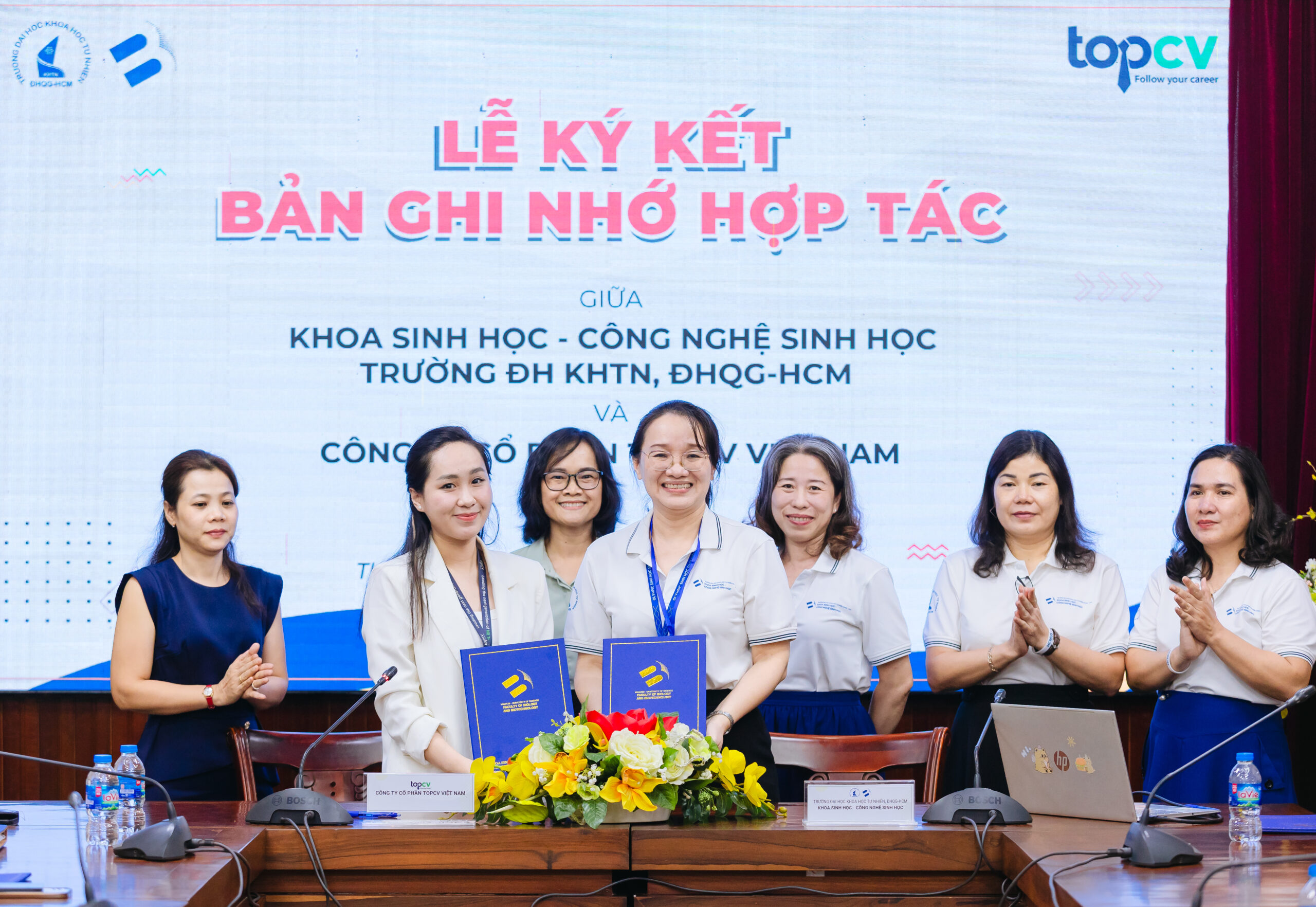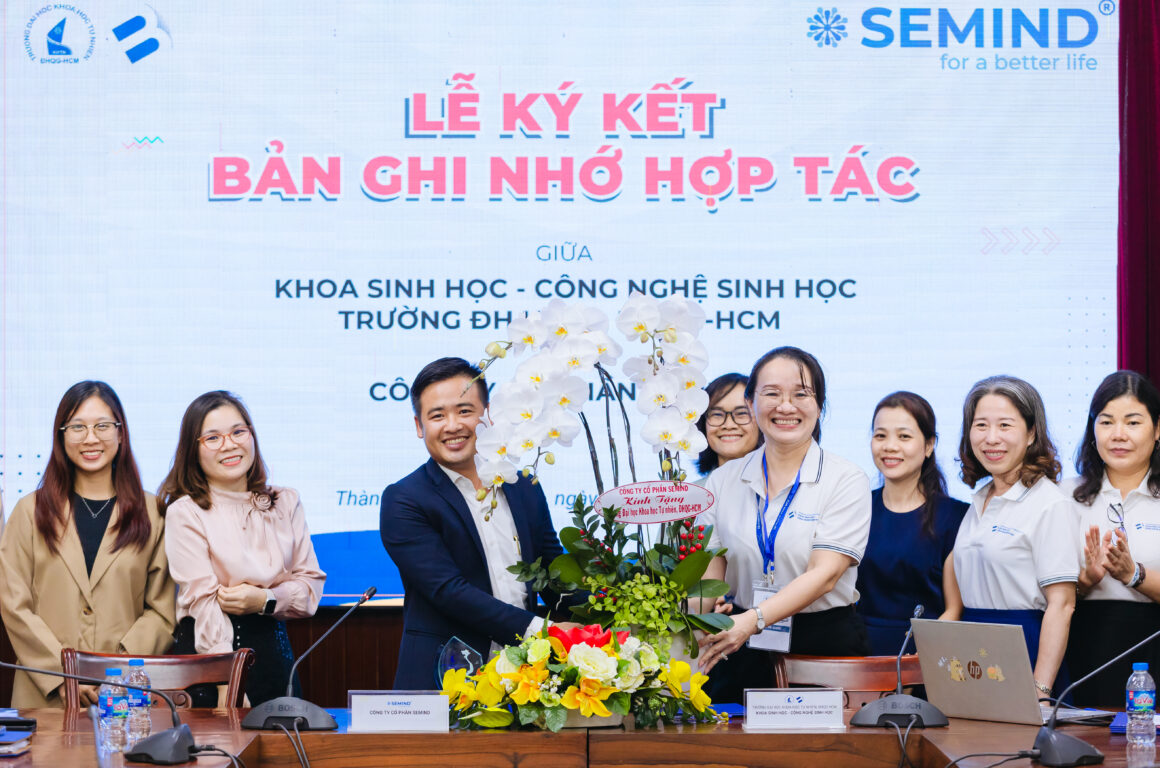 The signing ceremony was attended by Assoc. Prof. Quách Ngô Diễm Phương – Dean of The Faculty of Biology – Biotechnology, Assoc. Prof. Trương Hải Nhung – Vice Dean, alongside academic staff and administrators. Representing the partner enterprises were Dr. Lee Kun Gu – Vice President of Technology (VOS DISCOVERY), Mr. Nguyễn Bá Phong – Director of Ho Chi Minh City Branch (SEMIND), and Ms. Đồng Ngọc Phương Quyên – Executive of Partnership & Community (TopCV Viet Nam).