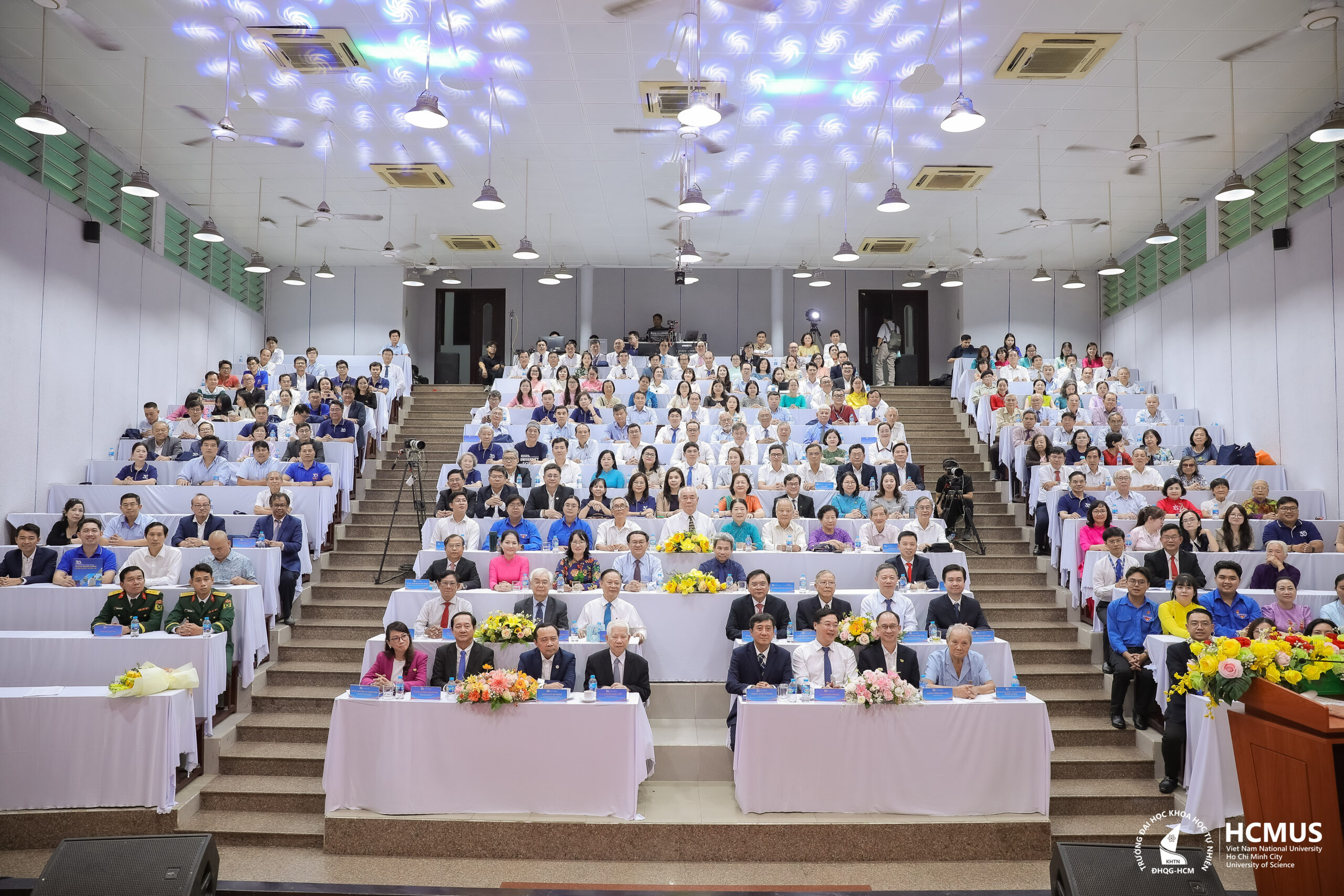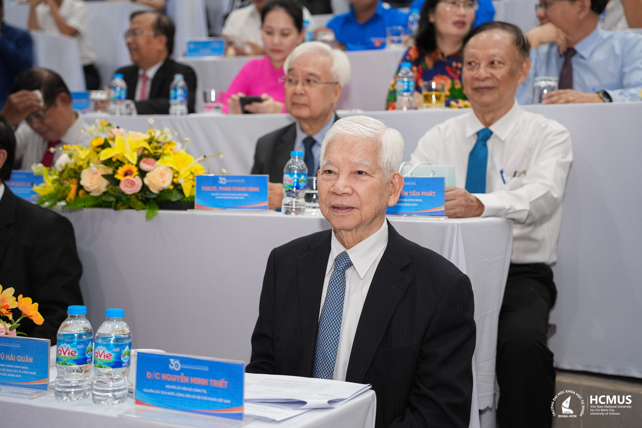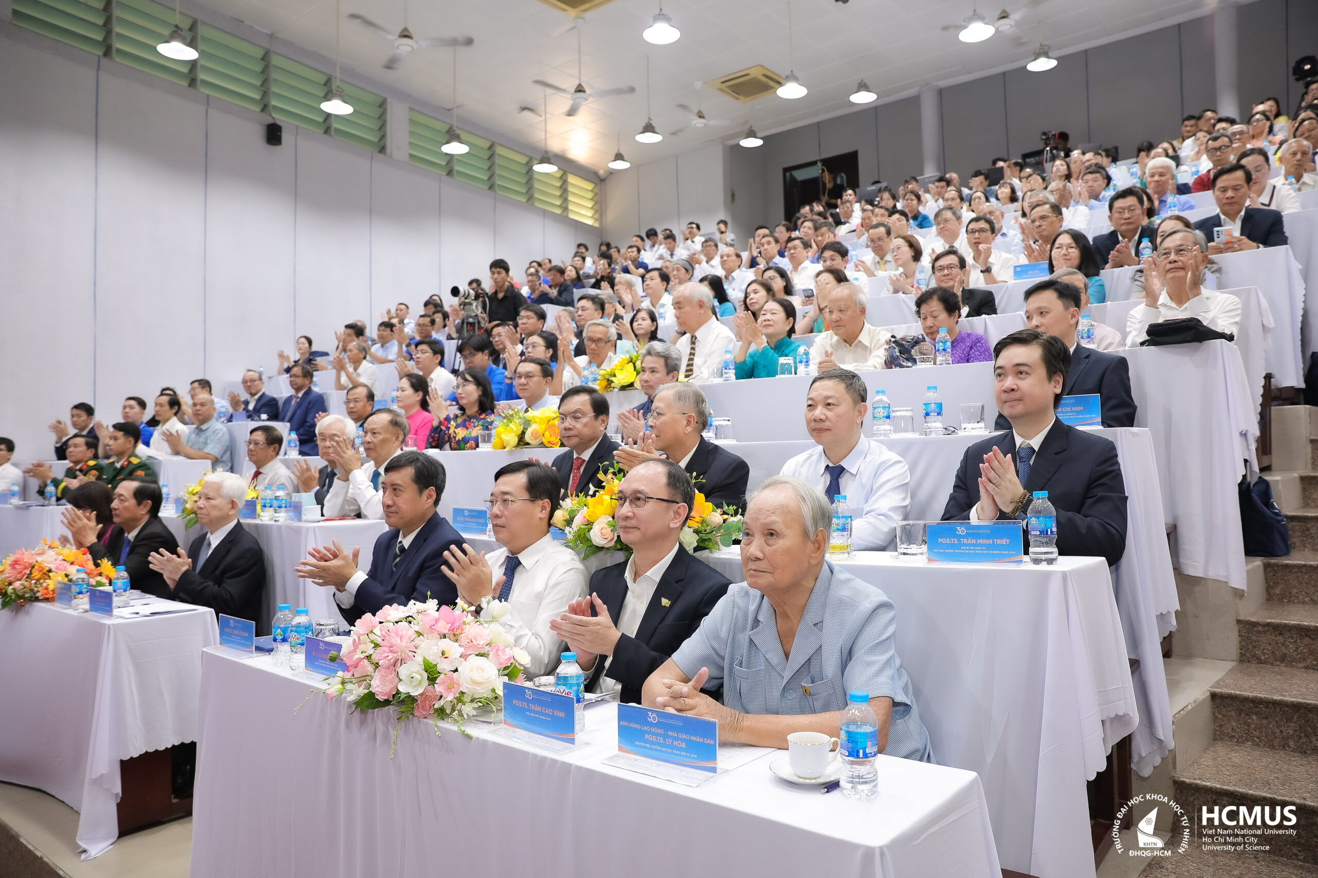 Present at the ceremony were Mr Nguyễn Minh Triết, former President of the Socialist Republic of Viet Nam; Mr Lê Quốc Phong, Standing Deputy Secretary of the Ho Chi Minh City Party Committee; Assoc. Prof. Vũ Hải Quân, Standing Vice Minister of Science and Technology; Prof. Nguyễn Thị Thanh Mai, Chancellor of VNUHCM; along with representatives from various ministries, sectors, VNUHCM leadership, senior academics, corporate partners, and generations of HCMUS staff and students.
