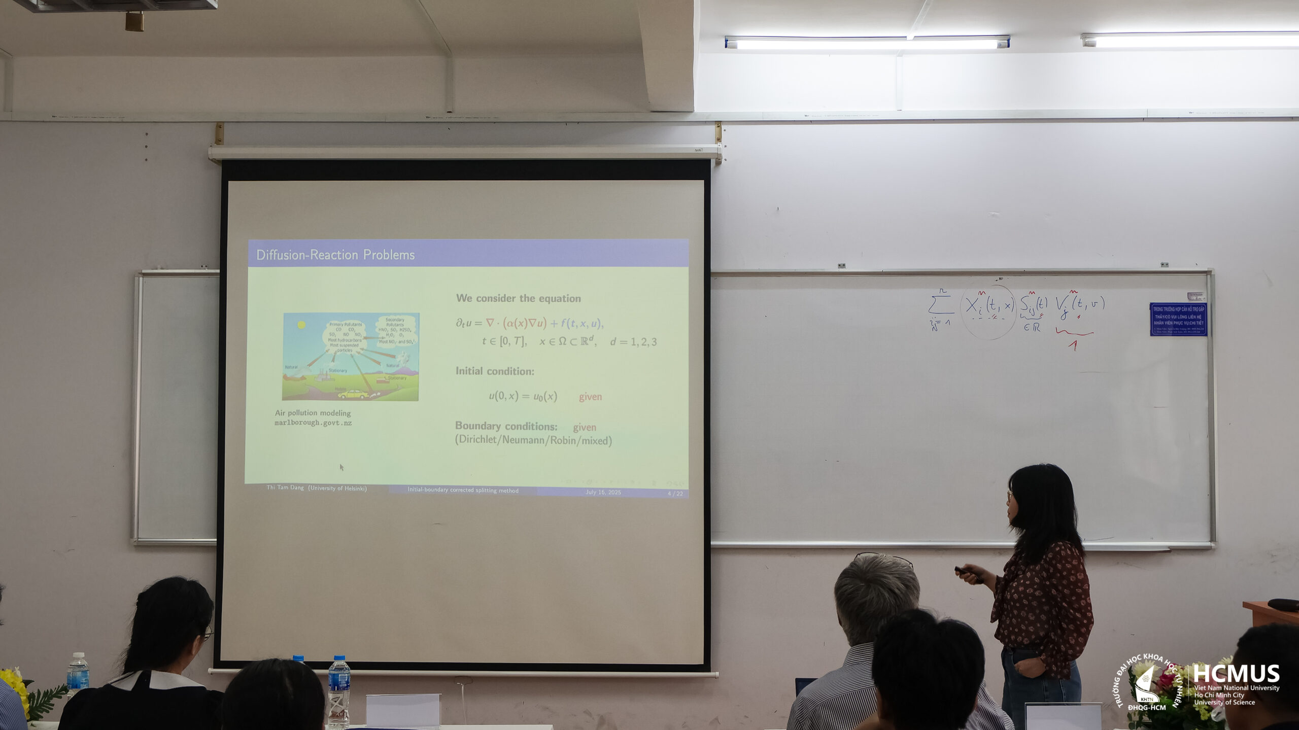 – Dr Đặng Thị Tâm (University of Helsinki) presented “An initial-boundary corrected splitting method for diffusion-reaction problems”, proposing a novel splitting approach that overcomes convergence order degradation often observed in classical splitting methods under Dirichlet boundary conditions. The method does not require boundary-dependent correction terms, yet achieves higher accuracy and computational efficiency, offering a practical solution for simulating diffusion–reaction phenomena in complex physical domains.