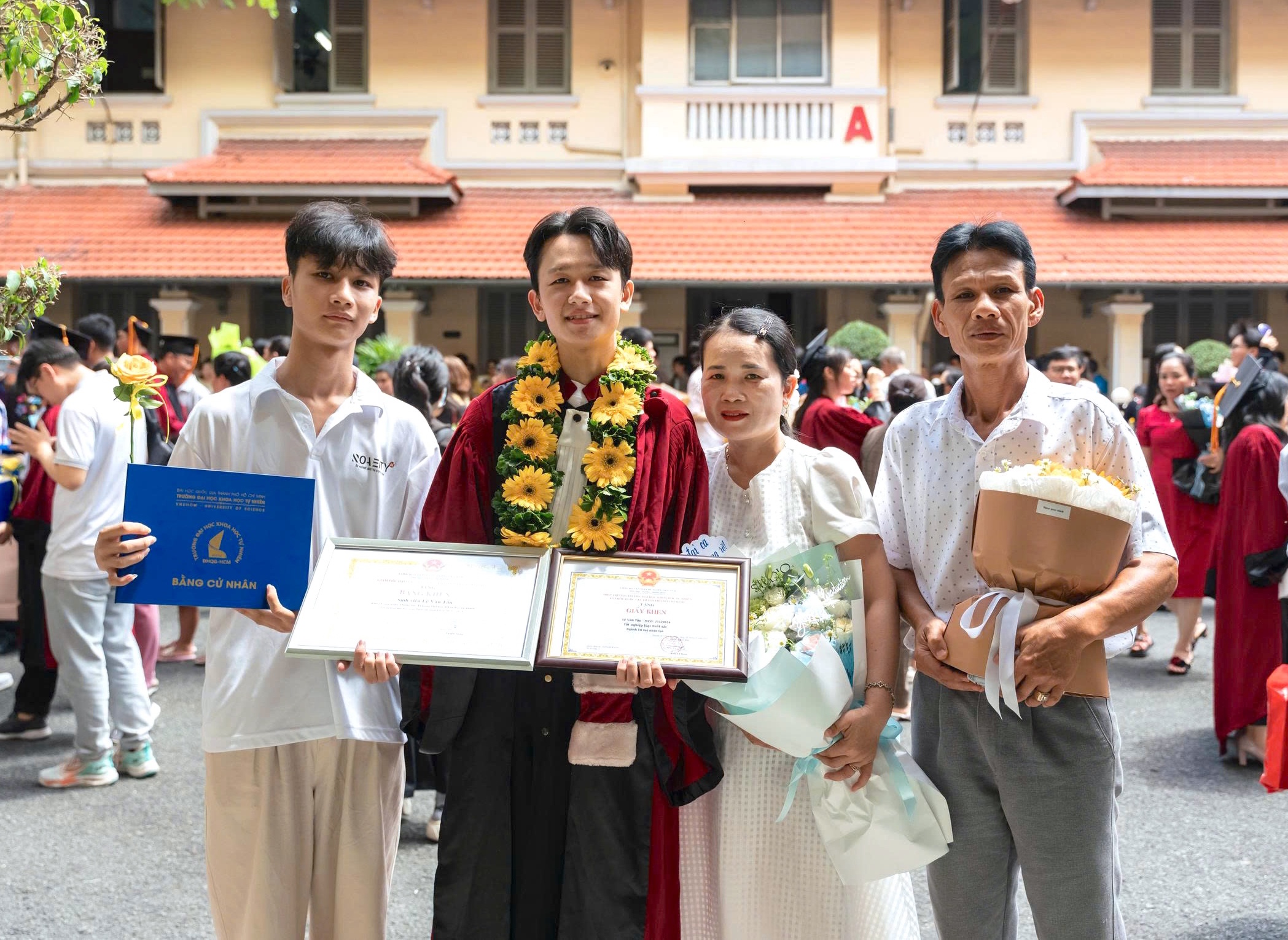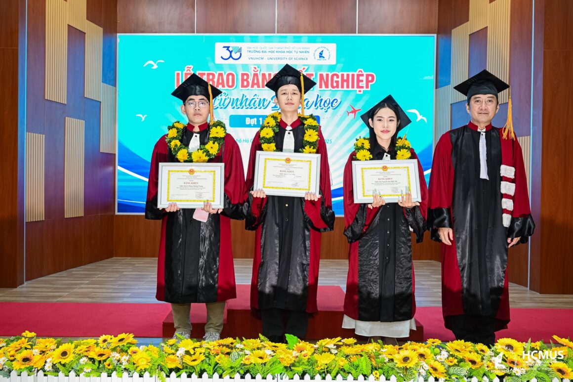 Lê Văn Tấn (second from left) receiving his Bachelor’s degree with Distinction in Artificial Intelligence at the graduation ceremony of VNUHCM-University of Science.