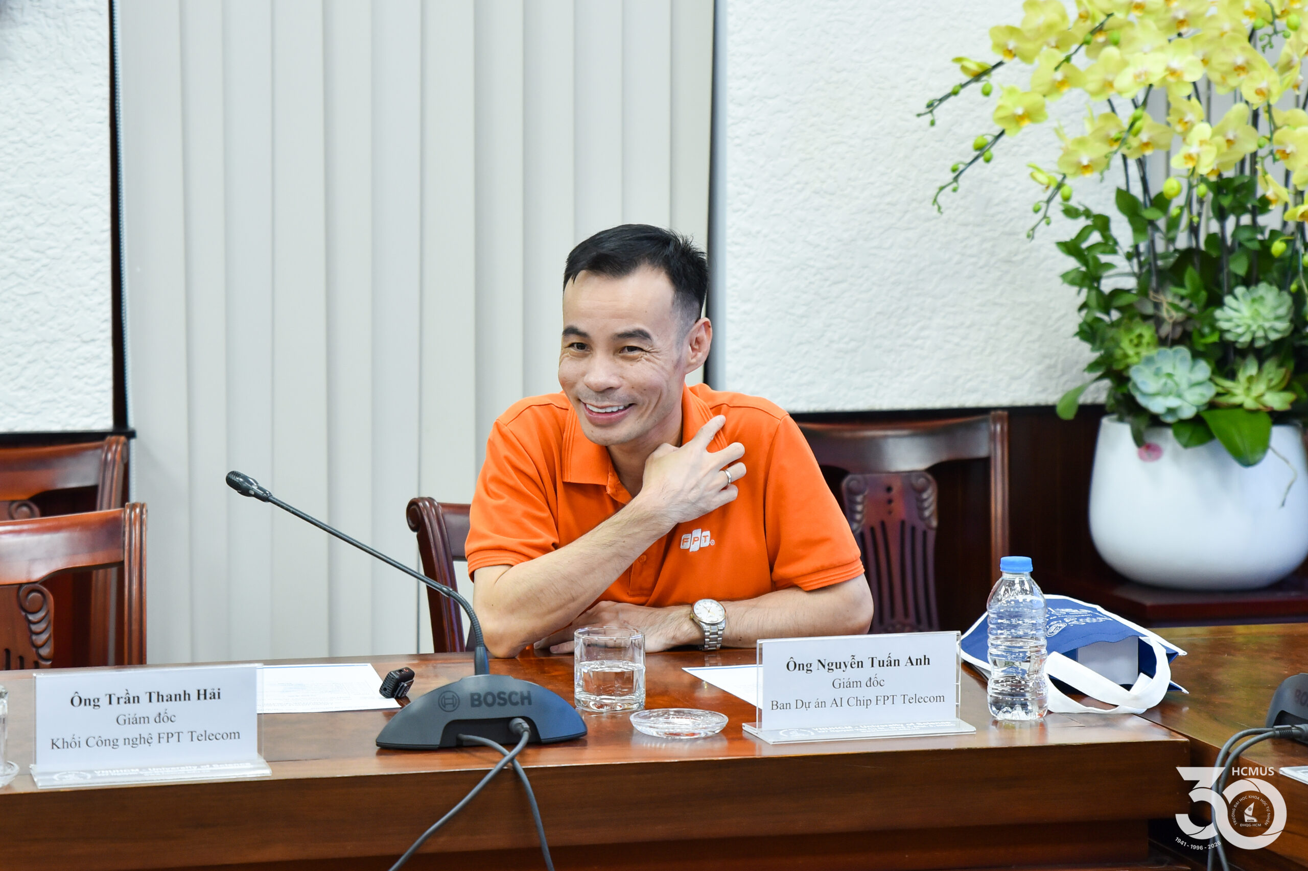 The ceremony was attended by representatives from FPT Telecom, including Mr Trần Thanh Hải, Chief Technology Officer, alongside leadership from the AI Chip Project and the Human Resources Department. HCMUS was represented by Associate Professor Trần Lê Quan, President, as well as leaders from the External Relations Office, the Faculty of Electronics and Telecommunications, and relevant departmental delegates.