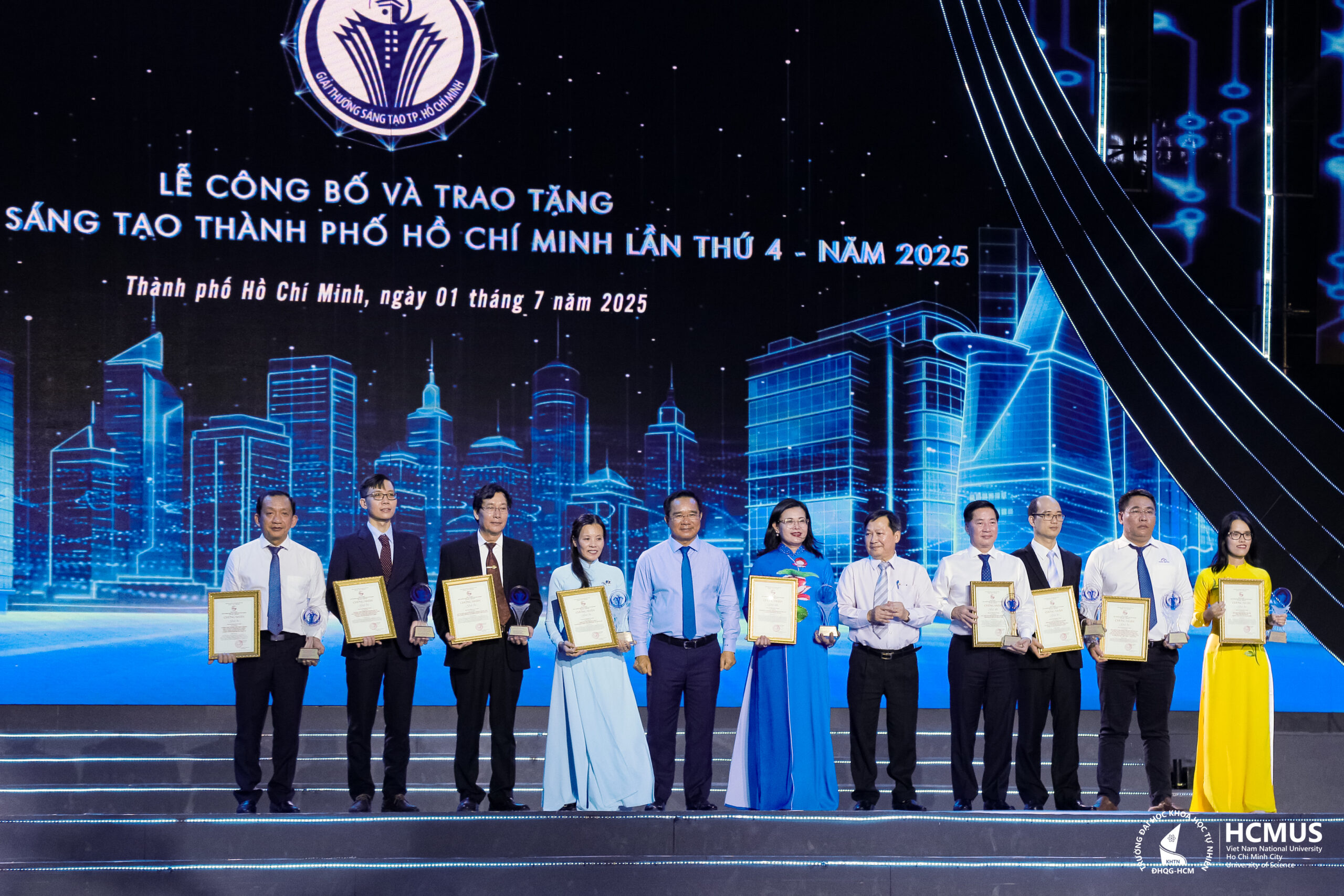 Representatives of award-winning author teams in the field of Science and Engineering receiving prizes at the 2025 Ho Chi Minh City Innovation Awards, with three honoured projects belonging to HCMUS.