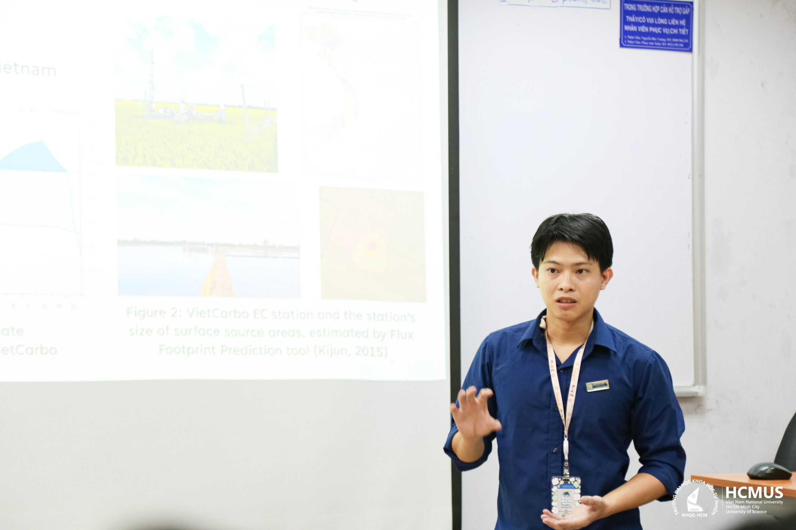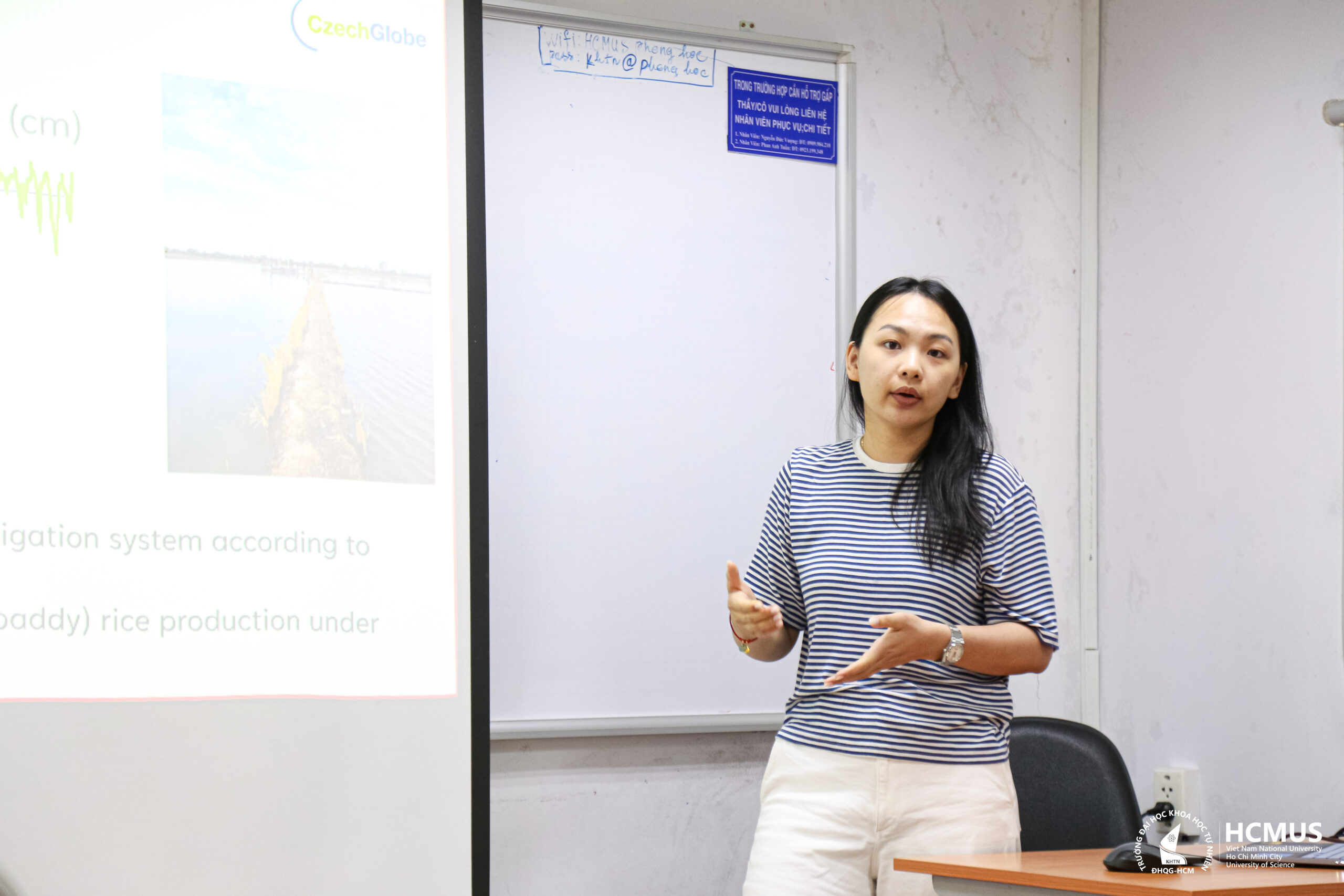 Regarding climate measurement, Prof. Marek also shared information on CzechGlobe’s advanced eddy covariance monitoring stations, which continuously track greenhouse gas and energy fluxes in different ecosystems. Complementing this, MSc. Vũ Hoàng Ngọc Khuê – research fellow at CzechGlobe and supervisor of the monitoring station at the Láng Sen Wetland Reserve (Long An Province) – presented a case study in Viet Nam. The system, located in the buffer zone of wetland forest and rice fields, demonstrated the effectiveness of eddy covariance technology in monitoring carbon fluxes, providing quantitative data for research in agriculture, environment, and climate science.
