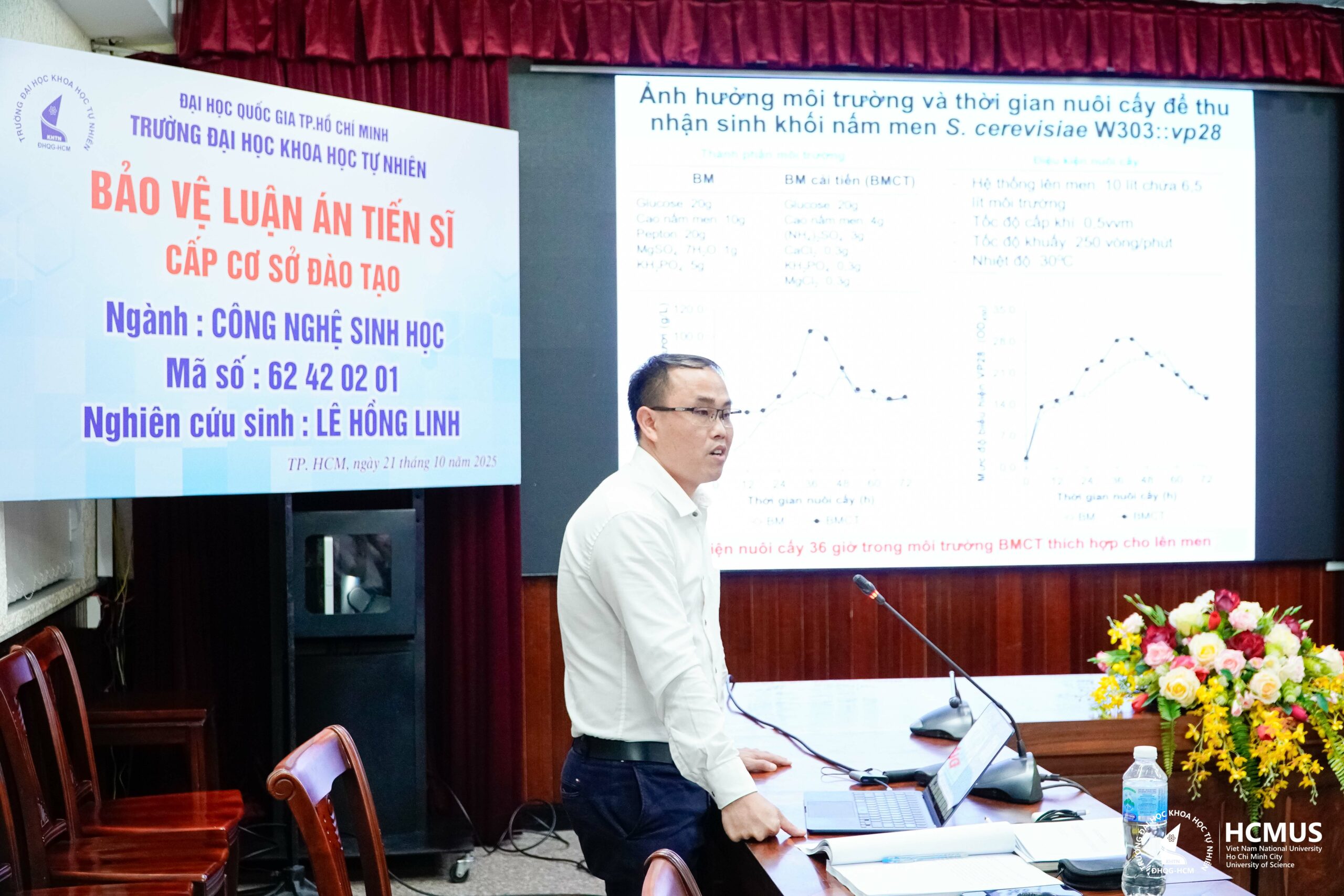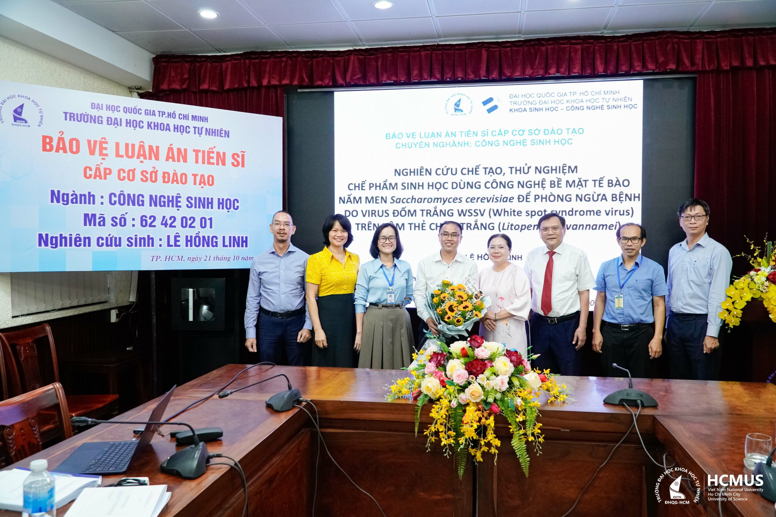 On October 21, at the VNUHCM-University of Science (HCMUS), Researcher Lê Hồng Linh successfully defended the doctoral thesis titled ‘Study on the Preparation and Testing of a Biological Product Using Yeast Cell Surface Technology (Saccharomyces cerevisiae) for the Prevention of White Spot Syndrome Virus (WSSV) in Whiteleg Shrimp (Litopenaeus vannamei),’ under the supervision of Prof. Đặng Thị Phương Thảo.