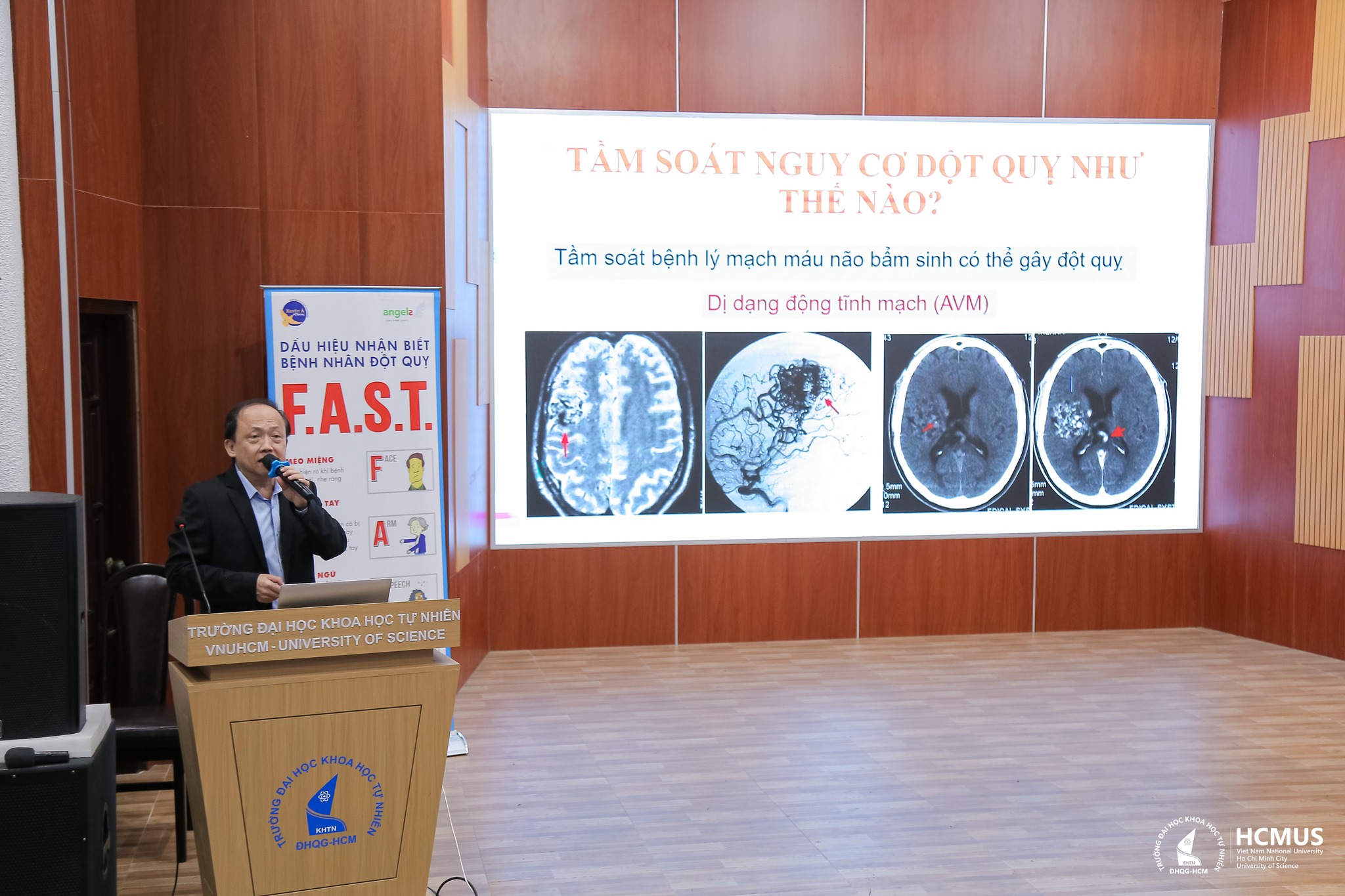 Dr Diệp Trọng Khải – Head of the Stroke Unit at Xuyen A General Hospital, expounding upon stroke prophylaxis and screening via lifestyle modification and risk factor control.