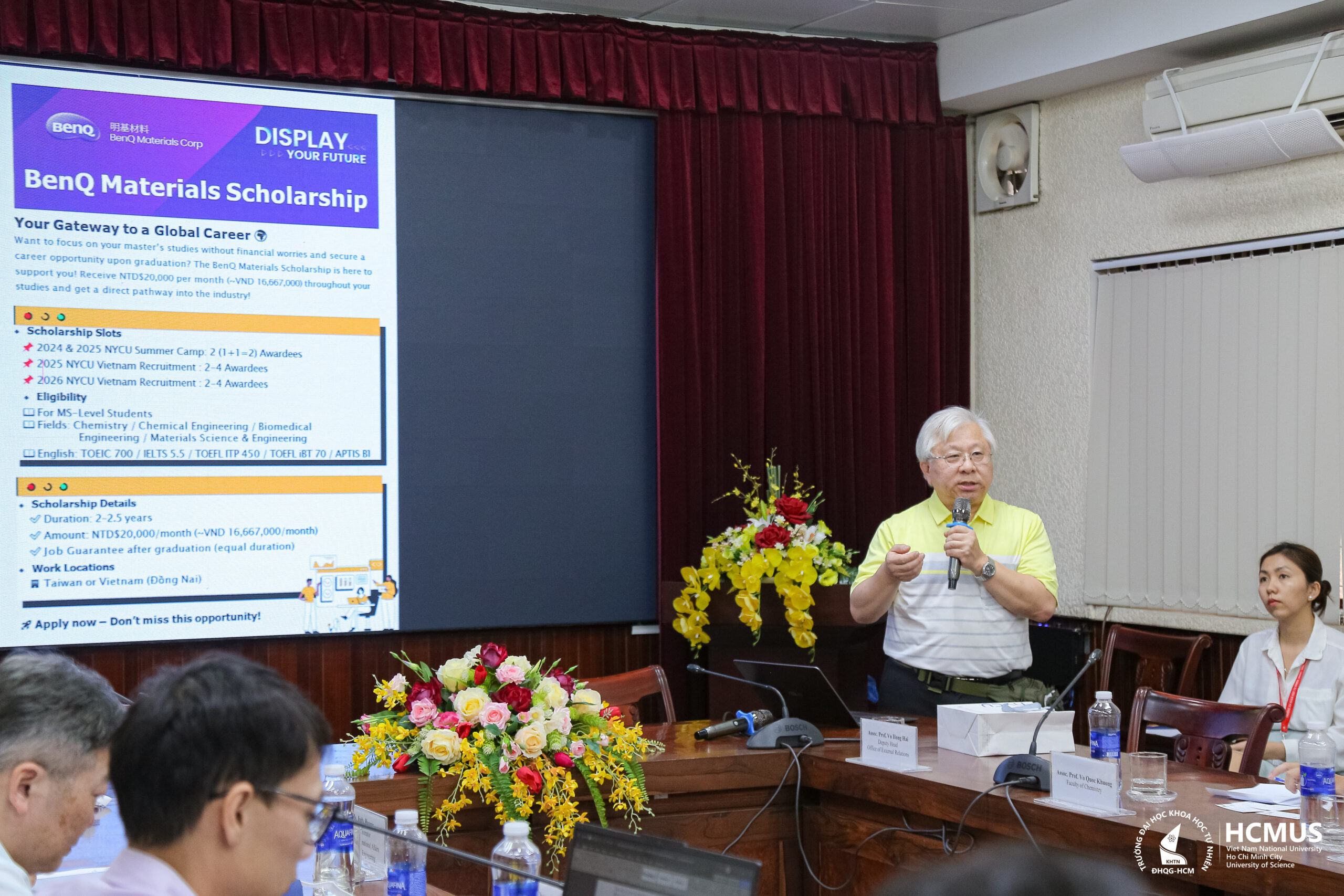 During the formal session, both institutions focused on strategic cooperation in education, scientific research, and academic exchange. The NYCU delegation provided an overview of academic programmes, research strengths, and the campus environment. Notably, the delegation detailed the BenQ Materials Scholarship—a dedicated fund for postgraduate students in Materials Science and Engineering at NYCU. This scholarship offers a monthly stipend of 20,000 TWD for approximately two years, coupled with career opportunities at the BenQ Materials Corporation in Taiwan or the branch offices in Viet Nam. The programme targets candidates with research backgrounds in biomedical materials and sensors, semiconductor manufacturing, polymer composites, and related fields such as Chemistry, Chemical Engineering, and Biomedical Engineering.